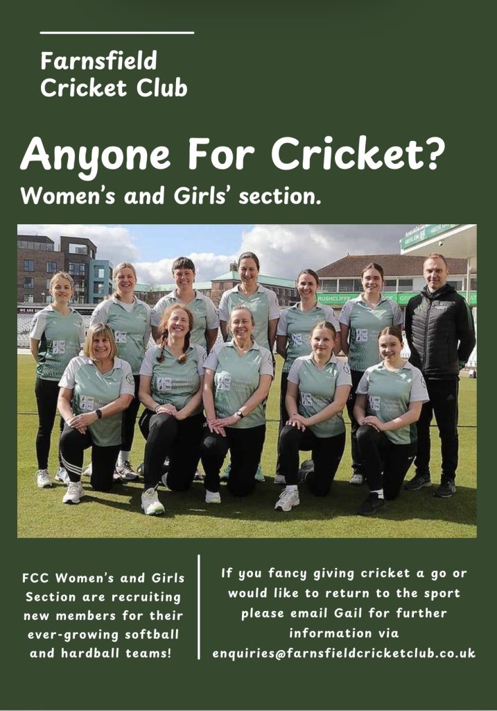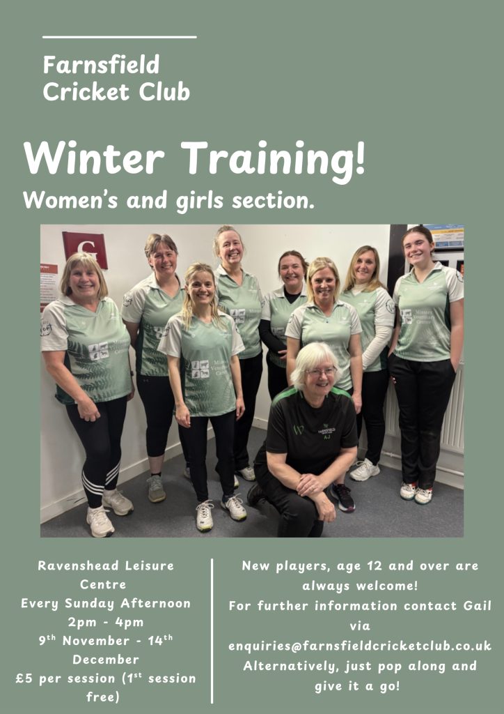 Women’s Indoor training Sun 9th Nov – Sun 14th Dec 2-4pm at Ravenshead Leisure Centre. New members are always welcome. Please contact enquiries@farnsfieldcricketclub.co.uk for further details.